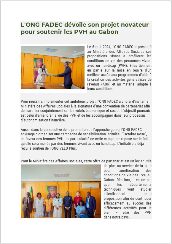 Le 6 mai 2024, l'ONG FADEC a présenté au Ministère des Affaires Sociales ses propositions visant à améliorer les conditions de vie des personnes vivant avec un handicap (PVH).
